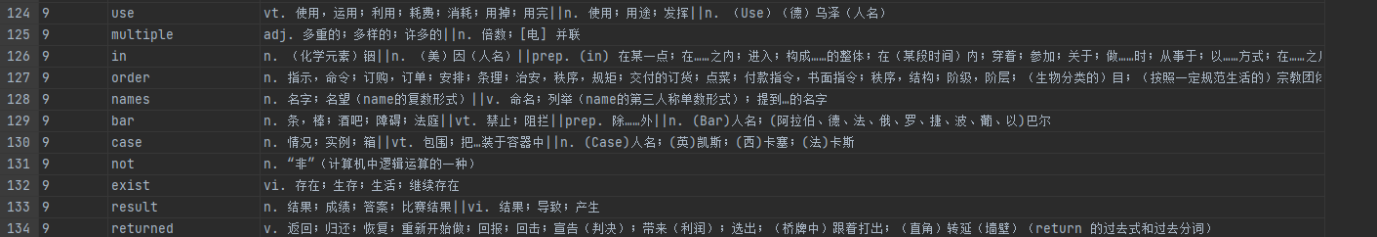 def DataClea(data): for temp in data: if len(temp[0].translate(str.maketrans('', '', digits))) > 1: tranRequestContent = tranRequest(temp[0]) dictWord = {} dictWord["count"] = str(temp[1]) dictWord["EnglishWord"] = tranRequestContent["query"].lower() try: dictWord["EnglishExplains"] = "||".join(tranRequestContent["basic"]["explains"]) except: print(tranRequestContent["query"].lower() + '单词翻译出错!') dictWord["EnglishExplains"] = " " ToCsvFile(dictWord)