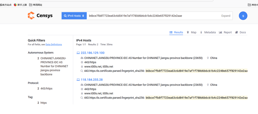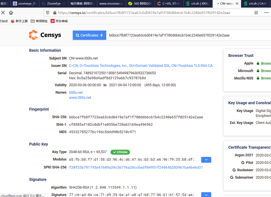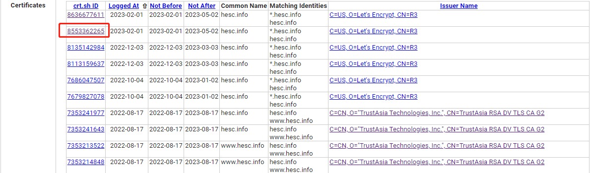 找到域名证书信息,点击crt.sh id进入证书详细页面,通过证书HASH搜索IP