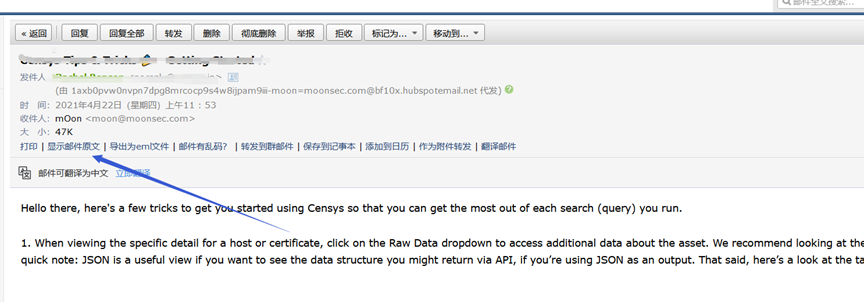 网站在发信的时候,会附带真实的IP地址 进入邮箱 查看源文件头部信息 选择from