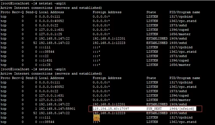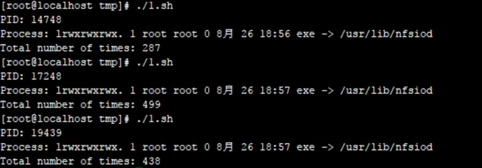 跑了三次脚本,可以发现短连接每次发起的进程 Pid 一直在变,但已经捕捉到发起该异常连接的进程源文件为 /usr/lib/nfsiod