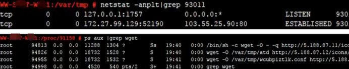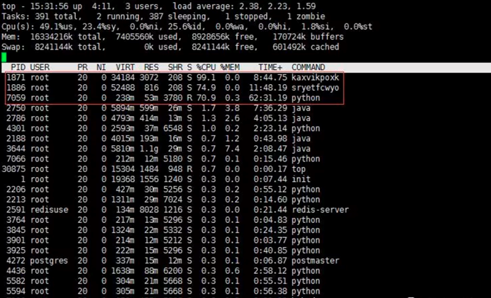 登录服务器,查看系统进程状态,发现不规则命名的异常进程、异常下载进程 :