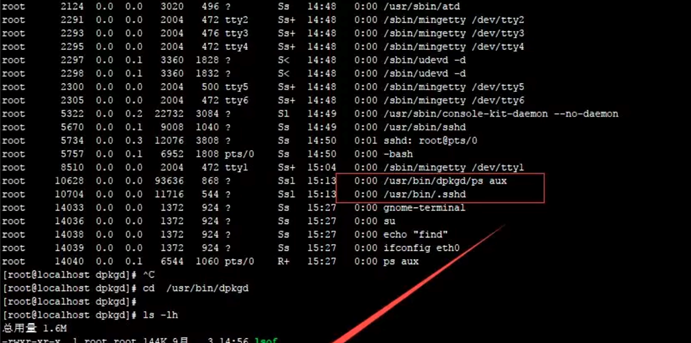 查看进行发现 ps aux 进程异常,进入该目录发现多个命令,猜测命令可能已被替换