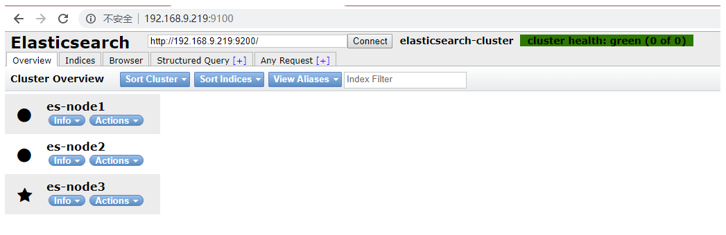 在浏览器地址栏访问http://192.168.9.219:9200/_cat/nodes?pretty查看节点状态。
