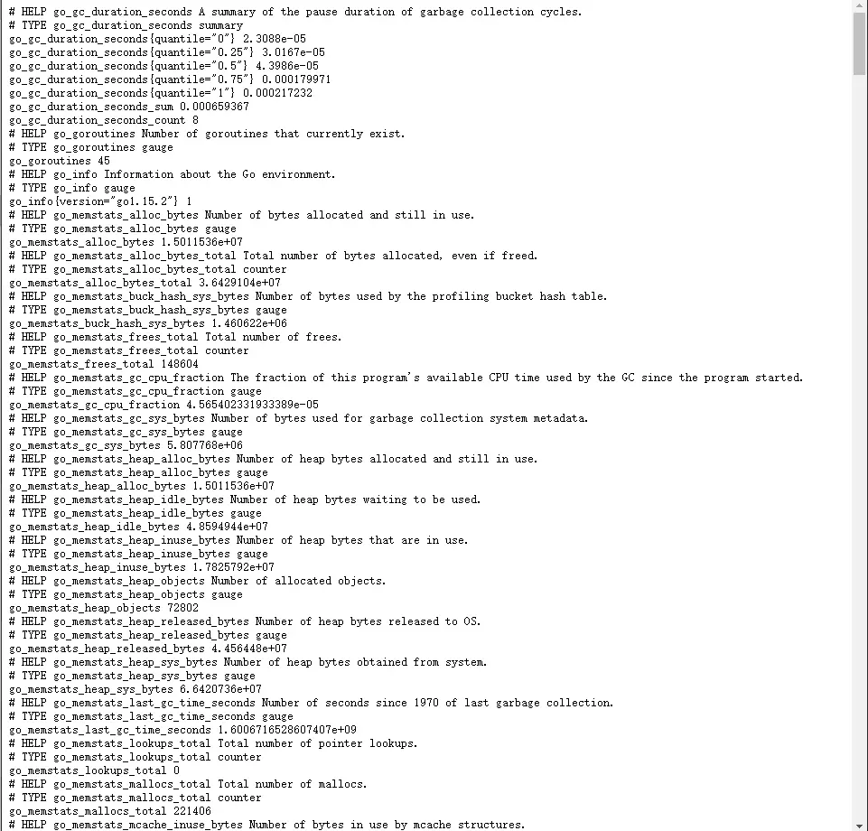 通过浏览器 http://10.10.11.120:9090/metrics 可以查看监控到的数据