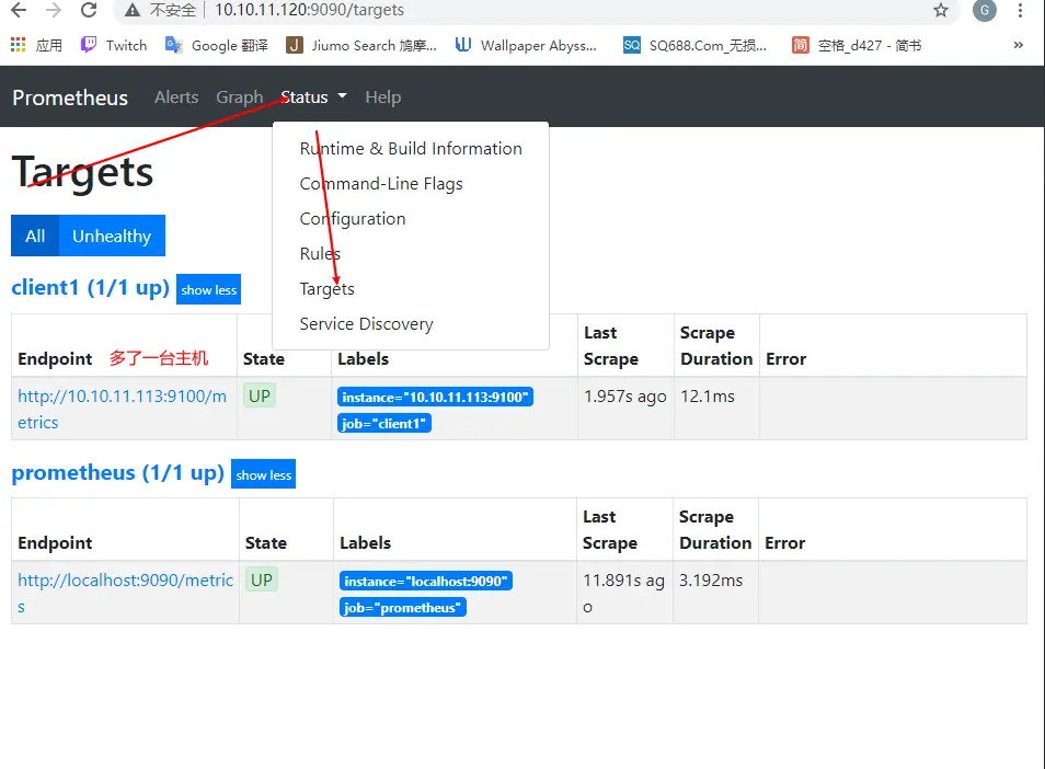 | [root@prometheus ~]# vim /usr/local/prometheus/prometheus.yml - job_name: 'client1' static_configs: - targets: ['10.10.11.113:9100']