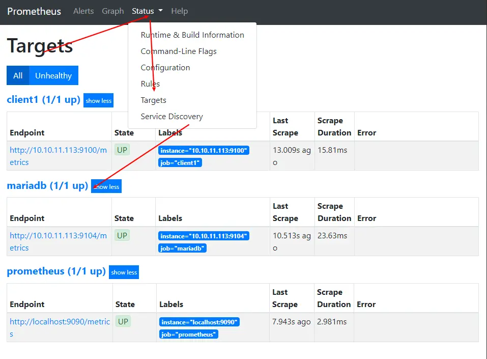 回到web管理界面 –>点Status –>点Targets –>可以看到监控mariadb了