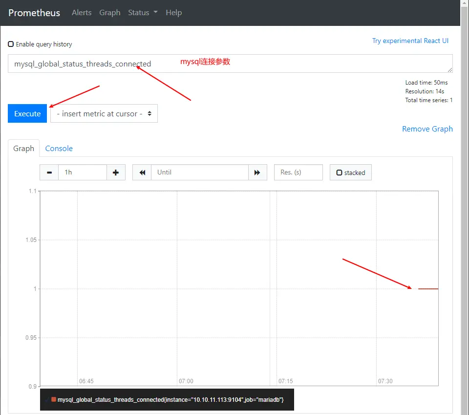 | [root@prometheus ~]# vim /usr/local/prometheus/prometheus.yml - job_name: 'mariadb' static_configs: - targets: ['10.10.11.113:9104'] [root@prometheus ~]# pkill prometheus [root@prometheus ~]# /usr/local/prometheus/prometheus --config.file="/usr/local/prometheus/prometheus.yml" &