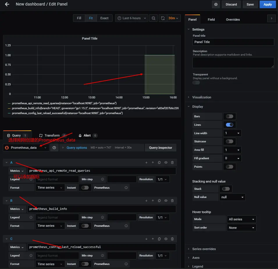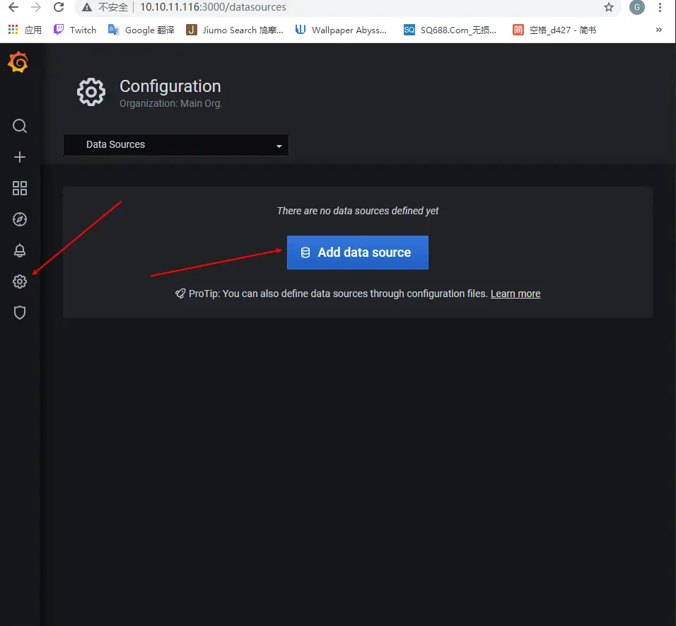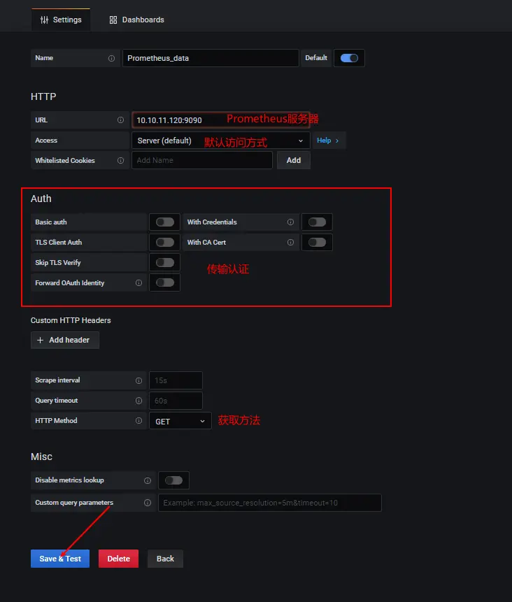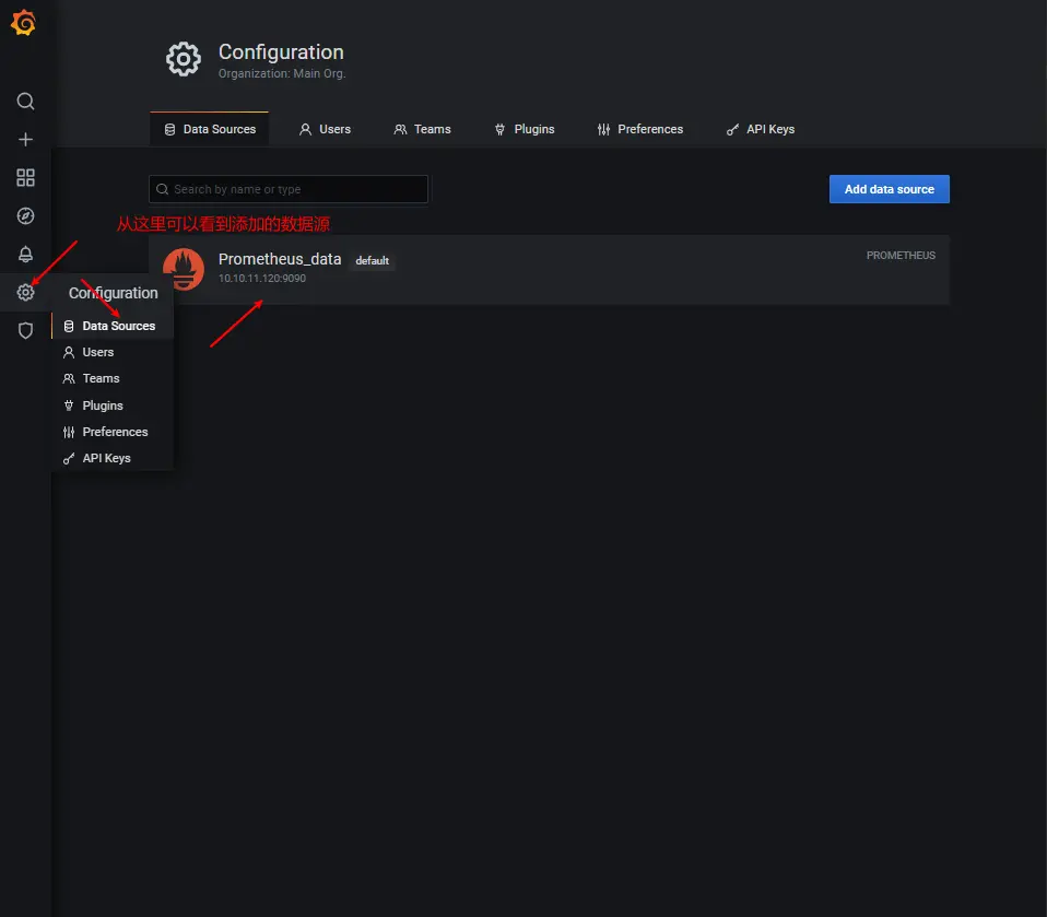 将Prometheus服务器收集到的数据作为一个数据源添加到grafana,让grafana可以得到Prometheus的数据